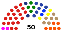 After the end of the revolution, a provisional regional house of representatives (DPRDS) was formed in 1950 with 34 members who were selected by a 165-member committee led by the city's mayor Koesbiyono. The 1950 DPRDS included 13 members of political parties, 7 members of labor unions, with other councillors representing other organisations.[3] The Indonesian Communist Party (PKI) held a majority in the city council following the 1955 general election and 1957 local elections. The other political parties – the Indonesian National Party, Masyumi, and Nahdlatul Ulama – boycotted the council after PKI legislators elected a PKI mayor in 1957.[4] Following the transition to the New Order, Semarang's legislative election starting in 1971 like other cities was dominated by Golkar.[5] PDI-P became the biggest party in the council after the fall of Suharto in the 1999 election, with 20 PDI-P councillors.[6]