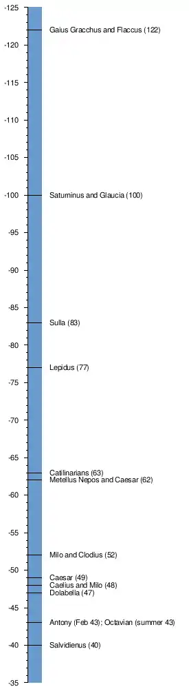 Its usage in the late republic also was in contrast to the general practice of the early republic to appoint dictators to resolve domestic unrest. By the time of the emergence of the senatus consultum ultimum in 121 BC, the dictatorship had been in abeyance for some time, the last having been appointed in 202 BC.[28] The development of the final decree was likely motivated by the dictatorship's abeyance.[29] That the consuls also were more likely to be in the city due to magisterial prorogation also made empowering the consuls to act more feasible.[30]