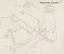 Senghenydd (Welsh: Senghennydd) is situated at the northern end of the Aber Valley, approximately four miles (6.4 km) north-west of Caerphilly[16][17] and eleven miles (18 km) north-west of Cardiff.[18] When geological surveys for coal began in 1890 it was a farming hamlet of around 100 people.[19][20] Coal was found, and sinking of the first mineshaft for Universal Colliery—which was owned and developed by William Lewis[lower-alpha 3]—began in 1891; the first coal was extracted in 1896.[17][22] The colliery's two shafts were both 1,950 feet (590 m) deep, the downcast Lancaster and the upcast York.[23][lower-alpha 4] Development of the pit coincided with the Boer War, and sectors of the underground workings were named after key places in the war, such as Pretoria, or the lifting of the sieges at Ladysmith, Mafeking and Kimberley.[20]