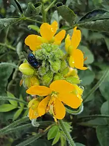 Senna species are pollinated by a variety of bees, especially large female bees in genera such as Xylocopa.[4] They rely on "buzz pollination" and some within that on "ricochet pollination", which is a secondary pollen presentation where the pollen is not deposited on the pollinator's body by direct contact with the anthers.[18] The flowers have two sets of stamen: feeding stamens, which are longer, and pollinating stamens, which are smaller in size.[19] Due to buzz pollination, the pollens from the pollinating stamens get thrown from the anthers and ricochets against the petals multiple times before it settles on the dorsal side of the pollinating bee. The roughness on the petal walls causes the pollen to slow down its speed. The ricocheting effect alone cannot ensure effective pollen dissemination. It is aided by static charges wherein the flying bees become positively charged owing to the friction in the air and the pollen becomes negatively charged because of which they naturally get attracted to the bees body. The pollinator bee ends up carrying the pollen and also gets to feed on the pollen which is on the feeding stamens.[18]