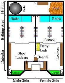 There are many different layouts for a Japanese sentō or public bath. Most traditional sentō, however, are very similar to the layout shown on the right. The entrance from the outside looks somewhat similar to a temple, with a Japanese curtain (暖簾, noren) across the entrance. The curtain is usually blue and shows the kanji 湯 (yu, lit. hot water) or the corresponding hiragana ゆ. After the entrance, there is an area with shoe lockers, followed by two long curtains or doors, one on each side. These lead to the datsuijo (脱衣場, changing room), also known as datsuiba for the men and women respectively. The men's and the women's sides are very similar and differ only slightly.
