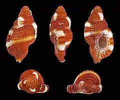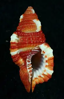 The shell size of Septa rubecula varies between 25 mm and 55 mm.[2] These moderately small shells are commonly rather solid, ovate and vetricose. The six convex whorls are sculptured with one varix on each whorl and with spiral cords, nodules and knobs. Siphonal canal is moderately long. The external shell surface is quite variable in color. It may be bright or dark red, orange or brown with a small white or yellowish transversal band on whorls and with small white patches on varices. The outer lip is ornamented with 8–10 white prominent denticles. The columella is reddish. The inner surface of the aperture is white. The periostracum is yellowish-brown.[5]