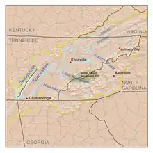 The Sequatchie River is a 116-mile-long (187 km)[2] waterway that drains the Sequatchie Valley, a large valley in the Cumberland Plateau in Tennessee. It empties into the Tennessee River downstream from Chattanooga near the Tennessee-Alabama state line.