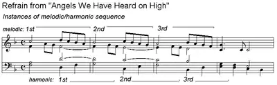 A well-known popular example of a threefold descending fifths diatonic sequence is found in the refrain from the Christmas carol "Angels We Have Heard on High,"[4] as illustrated immediately below ("Glo...ria in excelsis Deo"). The one-measure melodic motive is shifted downward at the interval of a second, and the harmonic aspect does so likewise by following the circle of fifths ⓘ: