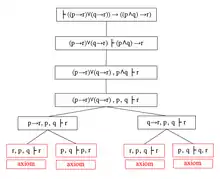 This process can always be continued until there are only atomic formulas in each side. The process can be graphically described by a rooted tree graph, as depicted on the right. The root of the tree is the formula we wish to prove; the leaves consist of atomic formulas only. The tree is known as a reduction tree.[20][22]