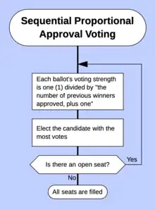 Sequential proportional approval voting (SPAV) or reweighted approval voting (RAV)[1] is an electoral system that extends the concept of approval voting to a multiple winner election. It is a simplified version of proportional approval voting. It is a special case of Thiele's voting rules, proposed by Danish statistician Thorvald N. Thiele in the early 1900s.[2] It was used (with adaptations for party lists) in Sweden for a short period from 1909-1921, and was replaced by a cruder "party-list" style system as it was easier to calculate.[3][4]