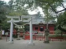 - The main shrine building (Honden), Worship Hall (Heiden) and Karamon gate were all former structures of the Oku-no-in of the Nikkō Tōshō-gū that were relocated to this site when the buildings erected by Tokugawa Hidetada were rebuilt by Tokugawa Iemitsu in 1644. The Honden is a one-bay Nagare-zukuri style structure with a copper roof. The Heiden is likewise an early Edo period (1615–1624) structure. It is a 3 × 5 bay Irimoya-zukuri style building with a copper roof. All three buildings were designated an National Important Cultural Property in 1956.[2][3][4]