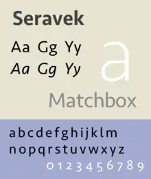 Seravek is a sans-serif typeface family designed by Eric Olson and released in 2007.[1] Olson described Seravek as having a neutral design of "near silence".[2][3] Seravek is a member of the humanist style of sans-serifs, with features such as a true italic inspired by handwriting.[4][5]