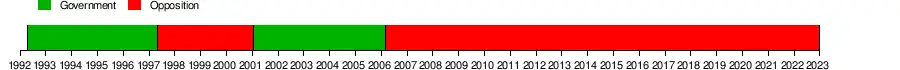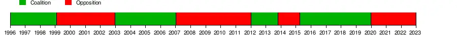 Year Leader Popular vote  % of popular vote # of seats Seat change Coalition Government