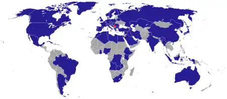 Serbia inherited about a third of the diplomatic facilities that belonged to the former Yugoslavia. After 2001 embassies in Chile, Colombia, Congo-Kinshasa, Ghana, Guinea, Lebanon, Mongolia, North Korea, Pakistan, Thailand, Venezuela, Vietnam, and Zimbabwe were closed due to financial or reciprocal reasons. In June 2008 the Government of Serbia made a decision to close consulates in Bari, Graz, and Malmö,[2] and later that year Foreign Minister Vuk Jeremić announced a plan to open a consulate-general in Knin (Croatia)[3] during the autumn and an embassy in Kuala Lumpur (Malaysia).[4] Foreign Minister also announced that some diplomatic missions might be closed but also announced a plan for opening missions in Kazakhstan, Los Angeles, Pakistan, UAE and Venezuela. Construction of the new embassy in Washington and reconstruction of the existing buildings in Paris, Nairobi and Brussels is also planned. In late 2008 it was announced that due to the economic crisis expansion plans will be reviewed.[5][6] In January 2009, the Government of Serbia announced opening of diplomatic trade offices. Many of them will be opened in different cities to the ones where embassies are located as they will be opened in largest economic centres. These offices will be opened in Russia, Germany, Italy, France, Austria, United Kingdom, Greece, Slovenia, Bosnia and Herzegovina, Croatia, Montenegro, Republic of North Macedonia, China, USA, Czech Republic, Slovakia, Hungary, Romania, Bulgaria, Ukraine, Switzerland, Turkey, India and South Korea. Government also announced the opening of police liaison offices for a better cooperation with foreign law enforcement agencies.[7] In April 2009, Serbian Ministry of Foreign Affairs announced that consulate from Rijeka will be moved to Knin in Croatia.[8] In May 2009 it was announced that the embassy in Peru will be temporarily closed and that the consulate-general in Lyon will be closed while the embassy in Kenya was reopened.[9] Due to the legal succession of the Yugoslav properties abroad, Serbia was obliged to hand over chanceries in Vienna, The Hague and Lisbon (to Croatia), Canberra (to the then-Republic of Macedonia), Ankara, Madrid, Oslo and Ottawa (to Bosnia and Herzegovina) as well as consular chanceries in Klagenfurt, Milan (to Slovenia), Toronto (to Croatia), Zurich and Athens (to the Republic of Macedonia).[10] Serbia will hand over the embassy building in Rome to Slovenia in 2011.[11] In November 2010, the Government of Serbia made a decision to open embassies in Kazakhstan, Azerbaijan and Qatar and reopen embassies in Congo-Kinshasa and Ghana in 2011 and announced a plan to open embassies in Oman, Chile, Venezuela and Pakistan in the future.[12] In March 2011, Serbia opened its embassy in Azerbaijan and Consulate-General in Herceg Novi.[13][14] In June 2011, Serbia opened its embassy in Kazakhstan.[15]