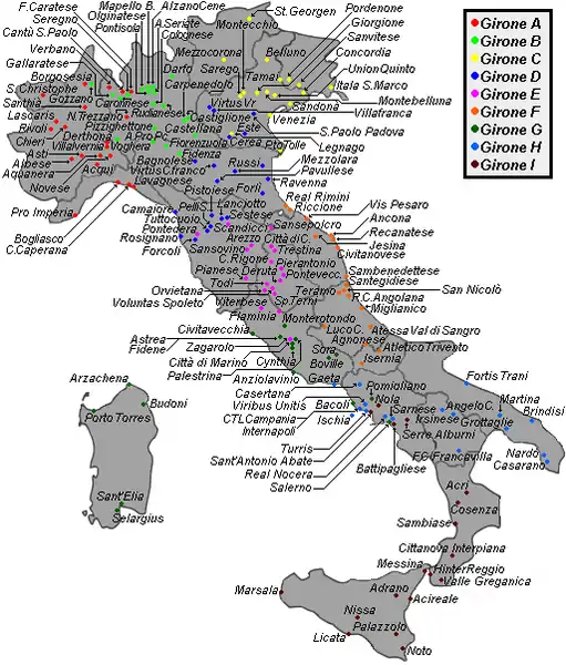 - ↑ Pizzighettone moved to the city of Crema. It will play in the italian football as U.S. Pergolettese 1932.