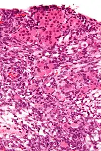 | Micrograph of a Sertoli–Leydig cell tumour. The Leydig cells have abundant eosinophilic or light pink cytoplasm. The Sertoli cells have a pale/clear cytoplasm. H&E stain. | |
