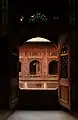 It has 12 rooms and four basements and includes a fountain. Colourful glass ceilings with geometrical designs, woodwork with engravings of various splendid designs on walls, a big resting place, made of wood and called Takht-e-Sulaimani, to take sunshine in winter, beautiful ventilators, slanting window-shades, wooden wall cupboards, chimneys and red bricks stairs with projected wooden frames are some of the prominent features of the house.