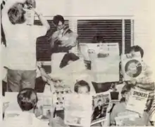 Ron Priddis and Anthony Schmitt, both graduate students at Brigham Young University, founded the Seventh East Press to give an "alternative voice" to BYU faculty and students.[2] Maxine Hanks and Gary Bergera were co-founding staff members, with Hanks writing the "Thrills" arts and entertainment feature and Bergera writing the "Grey Matters" column on theological issues.[3] Elbert Peck, the periodical's first managing editor,[4] said that he wanted to "help increase intellectual dialogue on campus". The students wanted the paper's design to appear conservative, in hopes that its articles could be "more daring".[5] Priddis, Schmitt, Hanks, and Peck produced the first issue of the 7EP on October 6, 1981. Peck cut and pasted columns, Schmitt designed the layout and advertisements, and Hanks typed and pasted copy. Schmitt and Hanks hand-lettered the headlines.[6] Their initial print run was 5,000 copies, and subsequent issues had a print run of 5,000 copies as well.[7] Tim Slover became managing editor beginning with the April 12, 1982, issue.[8] Scott Wooley, a University of Chicago law student, succeeded Slover as managing editor, and Dean Huffaker started managing production in the October 12, 1982, issue.[9][10] Dean Huffaker became managing editor starting with the January 11, 1983, issue that sparked the publication's ban from being sold on campus.[11]