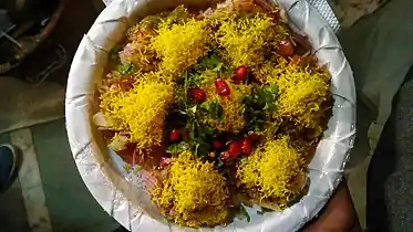 Sev puri is an Indian cuisine snack and a type of chaat.[1] It is a speciality that originates from Pune, Maharashtra, India.[2] In Pune and Mumbai, sev puri is strongly associated with street food, but is also served at upscale locations.[1][3] Recently, supermarkets have started stocking ready-to-eat packets of sev puri and similar snacks like bhelpuri.[4][5]