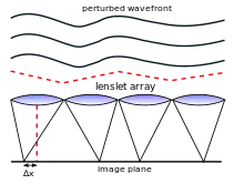 A Shack–Hartmann (or Hartmann–Shack) wavefront sensor (SHWFS) is an optical instrument used for characterizing an imaging system.[1][2] It is a wavefront sensor commonly used in adaptive optics systems. It consists of an array of lenses (called lenslets) of the same focal length. Each is focused onto a photon sensor (typically a CCD array or CMOS array[3] or quad-cell[4]). If the sensor is placed at the geometric focal plane of the lenslet,[5] and is uniformly illuminated,[6] then, the integrated gradient of the wavefront across the lenslet is proportional to the displacement of the centroid. Consequently, any phase aberration can be approximated by a set of discrete tilts. By sampling the wavefront with an array of lenslets, all of these local tilts can be measured and the whole wavefront reconstructed. Since only tilts are measured the Shack–Hartmann cannot detect discontinuous steps in the wavefront.