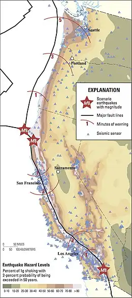 ShakeAlert is an earthquake early warning system (EEW) in the United States, developed and operated by the United States Geological Survey (USGS) and its partners.[1] As of 2021, the system issues alerts for the country's West Coast (specifically the states of California, Oregon and Washington). It is expected that the system will be expanded to other seismically active areas of the United States in the future.