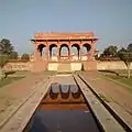 The square shaped terraces were both divided into four equivalent smaller squares by long fountains flanked by brick khayaban walkways designed to be elevated in order to provide better views of the garden.[8] Cascades were made to flow over a marble paths in what are known as chadors, or "curtains" into the middle terrace. Water collected into a large pool, known as a haūz, over which a seating pavilion was made.[2]