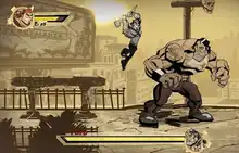 Shank has other attacks such as multiple grapple attacks, throw enemies, and is able to perform a pounce maneuver, in which he jumps in the air and lands on a nearby enemy. Some acrobatic abilities can also be performed, such as swinging from lampposts or other tall structures, and running along the front of things such as billboards.[2] On-screen enemies each have a health bar that displays on the player's HUD, akin to Final Fight.[3]