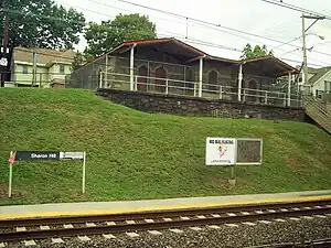 Sharon Hill station is a SEPTA Regional Rail station in Sharon Hill, Pennsylvania. It serves the Wilmington/Newark Line, with southbound service to Wilmington and Newark, Delaware and northbound service to Philadelphia. This station is about 12-mile (0.80 km) away from the Sharon Hill terminus of the SEPTA Route 102 trolley, although no direct connection exists between the two stations. It is not a staffed station and has no ticket machines. The historic station building, which was originally built in 1872,[4] is abandoned and is to be restored. It is located at Sharon & Woodland Avenues. Amtrak trains pass through but do not stop.