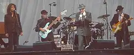 Sharon Robinson on stage with Leonard Cohen during concert at Edinburgh Castle, July 16, 2008