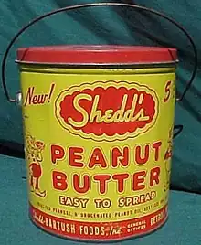The brand is remembered for its availability in buckets, originally tin, and later, plastic, which could be reused as sand buckets for sandboxes and beach play.[1] The product was discontinued in the 1980s, with the Shedd's brand now part of Unilever.