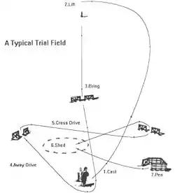 The exact layout of the trial field can vary significantly. Most experienced handlers agree that there are certain elements that are important to ensure that the challenge to the dog and handler is a fair and complete test. For USBCHA-sanctioned trials, these elements include:[11][12]