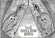 The Sheldon Duck[2] is a duck-like pareidolia found in an ash tree, which was felled at the beginning of the 20th century. According to local legend, in the early 1600s villagers saw a duck flying into an Ash tree, but they never observed it leaving the tree. When the same tree was felled, approximately 300 years later, a duck-like pattern with markings of the brain and lungs were found in the resultant timber boards. The boards were on display in Ashford in the Water Post Office for a while and postcards showing it were sold. Later, the timber merchant who felled the tree used these boards for making a mantlepiece at his home.