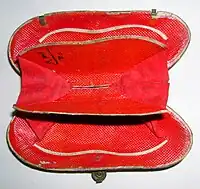 Freshwater mussel shells were often used. Because they are relatively large bivalves the purse could accommodate an interior mechanism such as an accordion to separate coins into different denominations, etc. Shark skin was often used as a liner, dyed appropriately in red, blue, green, etc.[1]