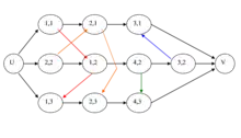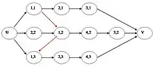 The first step is to draw out the precedence constraints in a graphical form called a graph (See Original Drawing picture). Each job originates at the "source", which we will label U on the graph. Each job will finish in a "sink" of jobs, which we will label V on the graph. Each row of nodes in the graph represents a job. Each node on the graph represents a task that is part of the job, the second number confirms the job being performed and the first number indicates what machine is being used for this task. At this point, the initial throughput time of each job should be calculated by adding up the processing times that the job takes on each of the machines (or rows). After the throughput time for each job has been calculated, the makespan for the system is determined by the longest throughput time of any individual job. This assumes no resource conflicts and gives a makespan of 22.