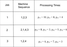 The Shifting Bottleneck Heuristic is used in manufacturing and service industries that include job shops with constraints on the order that the machines must be used for each job. A good example of a service industry that may use this technique is a hospital. The different areas within a hospital, such as physical examination, x-ray booth, cat scan, or surgery, could all be considered machines for this particular application. A precedence constraint in this context is when one machine must be used before another machine on any given job (or patient). These types of problems with multiple machines are known to be computationally very difficult. The processing time of each job on each machine is given (see chart on right for an example). Job j being performed on machine i is denoted ij. It is assumed that each machine can only work on one job at a time. The objective is to determine the schedule that will produce the shortest makespan.