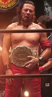 Upon his return, Nakamura received a shot at the title, now held by Bob Sapp, but he was defeated by the defending champion on May 3.[14] Later that month, Nakamura competed in his last MMA fight, defeating Alexey Ignashov with a forearm choke on May 22.[13] On December 11, Nakamura and his tag team partner Hiroshi Tanahashi defeated Kensuke Sasaki and Minoru Suzuki in a decision match to win the IWGP Tag Team Championship.[5] On January 4, 2005, at Toukon Festival: Wrestling World 2005, Nakamura defeated his own tag team partner to win the IWGP U-30 Openweight Championship.[5] During their tag team title reign, the two left for an excursion to Mexico, where they feuded with Los Guerreros del Infierno and defended the IWGP Tag Team Championship against Rey Bucanero and Olímpico.[5] On October 30, they lost the IWGP Tag Team Championship to Cho-Ten (Hiroyoshi Tenzan and Masahiro Chono).[5]