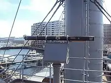 The function of the Mark 37 Director, which resembles a turret with "ears" rather than guns, was to track the present position of the target in bearing, elevation, and range. To do this, it had optical sights (the rectangular windows or hatches on the front), an optical rangefinder (the tubes or ears sticking out each side), and later models, fire control radar antennas. The rectangular antenna is for the Mark 12 FC radar, and the parabolic antenna on the left ("orange peel") is for the Mark 22 FC radar. They were part of an upgrade to improve tracking of aircraft.[1]