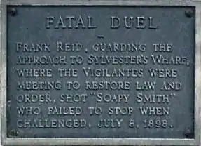 After the gang fled, Tanner rushed over to Reid and asked for his pistol, which lay under him. Reid replied that he was badly hurt, but he managed to roll off his gun. Except for two empty shells and one cartridge, it was empty. Reid died from his wounds twelve days later. Reid's funeral was the largest in Skagway's history[33] and his gravestone was inscribed with the words "He gave his life for the honor of Skagway."[34] On July 14, 1898, six days after the robbery and gunfight, John Stewart's gold was found by vigilantes inside Soapy's trunk located in an outbuilding behind Jeff Smith's Parlor. All but $600 of the gold was there.[35]