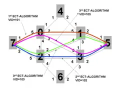 The last of these animated gifs, shown in Figure 7, demonstrates source destination ECT paths using all 16 of the standard algorithms currently defined.