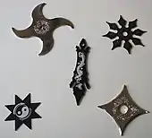 A shuriken (Japanese: 手裏剣; literally: "hand-hidden blade") is a Japanese concealed weapon that was used as a hidden dagger or metsubushi to distract or misdirect.[1][2]