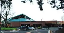 A $2.6 million bond measure went before voters in September 1979 to finance construction of an indoor pool, along with a second operating levy to pay for the operations.[7] The plan called for a main pool, a sauna, racquetball courts, a shallow pool for children, and a hydrotherapy pool, among other amenities.[7] Voters passed both of the measures for what would be a 26,777-square-foot (2,487.7 m2) center, with construction beginning in summer 1980.[8][9] The aquatics center was completed in 1981 and opened in September that year.[10] The facility included an indoor pool with locker rooms, a weight room, and three racquetball courts.[11] The new center cost $2.5 million to build,[11] with C.A. Lantz Construction Co. serving as the general contractor.[8] The project faced several delays due to leaks in the roof.[8][12]