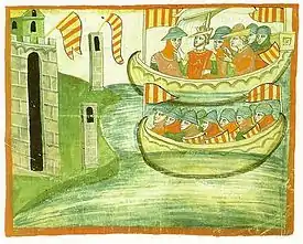 Arrival of Peter III Aragon in Sicily (1282). We can see him accompanied by his wife and her royal maids, to claim her legal rights to the throne. "Arrivo Aragonesi" (Biblioteca Vaticana)