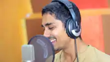 After finishing his education, he apprenticed with ad film maker Jayendra and cinematographer P. C. Sreeram, who both helped him join as an assistant director for Mani Ratnam's Kannathil Muthamittal.[6] He worked on the film throughout 2001, also making an uncredited appearance as a passenger on a bus. The script writer of that film, Sujatha, was insistent that Siddharth audition for Shankar's ongoing project Boys (2003), where the director had hoped to cast new actors. After consulting with Mani Ratnam, Siddharth met Shankar for an audition and was signed on the following day to play the lead role of Munna.[7][8] Siddharth shot for the film in 2002 alongside fellow debutants Genelia D'Souza, Bharath, Nakul, Thaman and Manikandan, while also suffering an injury which led to him being hospitalised for three days.[9] The story centred on six youngsters, conveying a message about the importance of a good education and career over other distractions, such as romance and sex, and marked a move away from Shankar's usual brand of vigilante films, gaining much hype and publicity prior to release.[10] The film opened to mixed reviews but emerged as a success at the box office, with reviewers noting the ensemble cast as "excellent".[11][12] Before the release of Boys, Siddharth signed on to feature in his mentor Mani Ratnam's political drama film, Aayutha Ezhuthu (2004) where he played the student Arjun Balakrishnan, a role which he described was similar to his real life persona. Featuring in an ensemble cast including Madhavan, Suriya and Trisha, Siddharth revealed that the sync sound method of filming that the team had employed, worked in his favour, as he was able to draw experience from his stage performances.[5] The film was released in May 2004 to positive reviews, with a critic from The Hindu noting Siddharth's portrayal as "neat", while another reviewer noted that Siddharth "is cool and discovers his comic side with some great one-liners."[13][14]
