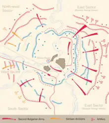 Bulgarian claim: ca. 7,000 killed and wounded Captured: 65,000 soldiers, 15 generals, 2,000 officers, 600 artillery guns, 16 flags[1][7] Turkish claim: 13,000 killed and wounded 42,500 captured[4] | ||||||