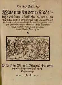 Lamberg, his soldiers and their families were escorted by several hundred cavalrymen towards Slunj. When the column moved away from the city, the escorting Ottoman soldiers started looting and harassing the wife of some soldier called Tomo Gal, who in turn killed Turk Veli-aga and wounded another Turk called Ibrahim. As they reached Mečevićev Brod (near Vaganac on Korana river) this turned into an all-out scuffle between two parties and most of the Christians were killed in the end.[33] Only Lamberg and several men managed to flee and reach Brest. Lamberg and the surviving defenders were later tried by court-martial for surrendering Bihać. A majority of the population was reluctant to leave their homes and decided to stay in Bihać. However, Hasan Pasha did not hold up his end of the deal and the city was sacked. In the first days following the capture more than 2,000 citizens were killed, while 800 children were taken captive and sent to Istanbul.[34] A contemporary news article (Zeitung) from Vienna about the battle reported that 5,000 Christians were killed.[35]