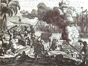 On the other hand, the Dutch rapidly regained their positions.[12] They mounted six large caliber guns on the high ground and many lesser caliber cannons for their defense. Soon they recommenced the bombardment now targeting bastions of Santiago and Conception.[50] However, due to the large number of wounded they suffered from a shortage of men until the arrival of reinforcements on the 11th.[85][87]