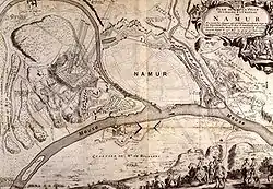 Vauban had secretly reconnoitred Namur the year before and managed to draw up plans of the town's defences. Guided by those drawings, the French constructed lines of circumvallation, and positioned several large, well-equipped batteries; trenches for three lines of advance opened on the night of 29–30 May.[10] William, meanwhile, moved his forces southwest closer to Namur, and Luxembourg moved his army of observation east from Gembloux to Longchamps, north of the town. William hoped to bring Luxembourg to battle on the Mehaigne, but the rain-swollen river had made a crossing impossible.