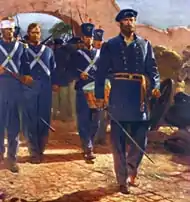 The force from the Cyane advanced toward the hamlet of San Vicente, where the insurgents had concentrated, but this did not stop Dupont's advance, supported by the guns of the Cyane.[2]: 175 [3]: 179 Lt. Heywood took 30 of his men and attacked the Mexicans still occupying the town, and then joined up with the Cyane men.[2]: 175