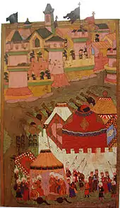 - ↑ In April, the diploma by which Suleiman confirmed Ibrahim Pasha's appointment as serasker included the following: "Whatever he says and in whatever manner he decides to regard things, you are to accept them as if they were the propitious words and respect-commanding decrees issuing from my own pearl-dispensing tongue." Quoted by Rhoads Murphey in Ottoman Warfare 1500–1700, p. 136.