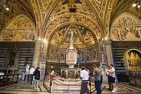 In the interior, the rectangular hall, divided into a nave and two aisles by two columns, contains a hexagonal baptismal font in bronze, marble and vitreous enamel, realized in 1417-1431 by the main sculptors of the time: Donatello (panel of "Herod's Banquet" and statues of the "Faith" and "Hope"), Lorenzo Ghiberti, Giovanni di Turino, Goro di Neroccio and Jacopo della Quercia (statue of John the Baptist and other figures). The panels represent the Life of John the Baptist, and include: