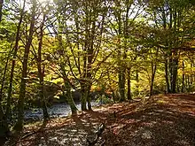 From its mountains rise the Jarama and Sorbe rivers, as well as other minor rivers such as the Jaramilla river, Berbellido river, Sonsaz river or del Ermito river. In its valleys grow the southernmost beech forests in Europe —Tejera Negra, La Pedrosa and Montejo beech forests—, without missing in its flora the holm oak, oak and Scotch pine. Among its fauna are wolves, vultures and small mammals. The part of the mountain chain in the province of Guadalajara is located within the Sierra Norte de Guadalajara Natural Park[1] and the Sonsaz Hunting Reserve extends over a large part of its territory.[2]