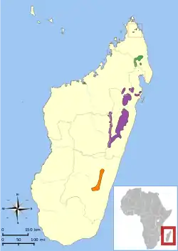 Range of the diadema group: red = P. perrieri, green = P. candidus,