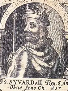 Sigfred and Anulo are mentioned by the historian Adam of Bremen in c. 1075 who believed that they were both nephews of Gudfred.[3] Adam's Gesta Hammaburgensis Ecclesiae Pontificum was known to some High medieval Norse writers who elaborated on his data. Thus the unusual name Anulo was misinterpreted as Hring (Latin annulus meaning "ring") while Sigfred was equated with the common medieval name Sigurd.[4] Various king lists such as the Gesta Danorum of Saxo Grammaticus (c. 1200) combine the names as Sigurd Hring and present this figure as the father and predecessor of the renowned Viking ruler Ragnar Lodbrok, conflated with historical Ragnfred.[5]