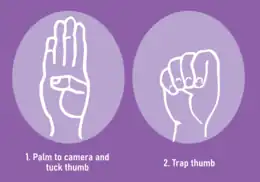 The signal is performed by holding one hand up with the thumb tucked into the palm, then folding the four other fingers down, symbolically trapping the thumb by the rest of the fingers.[3] It was designed intentionally as a single continuous hand movement, rather than a sign held in one position, so it could be made easily visible.